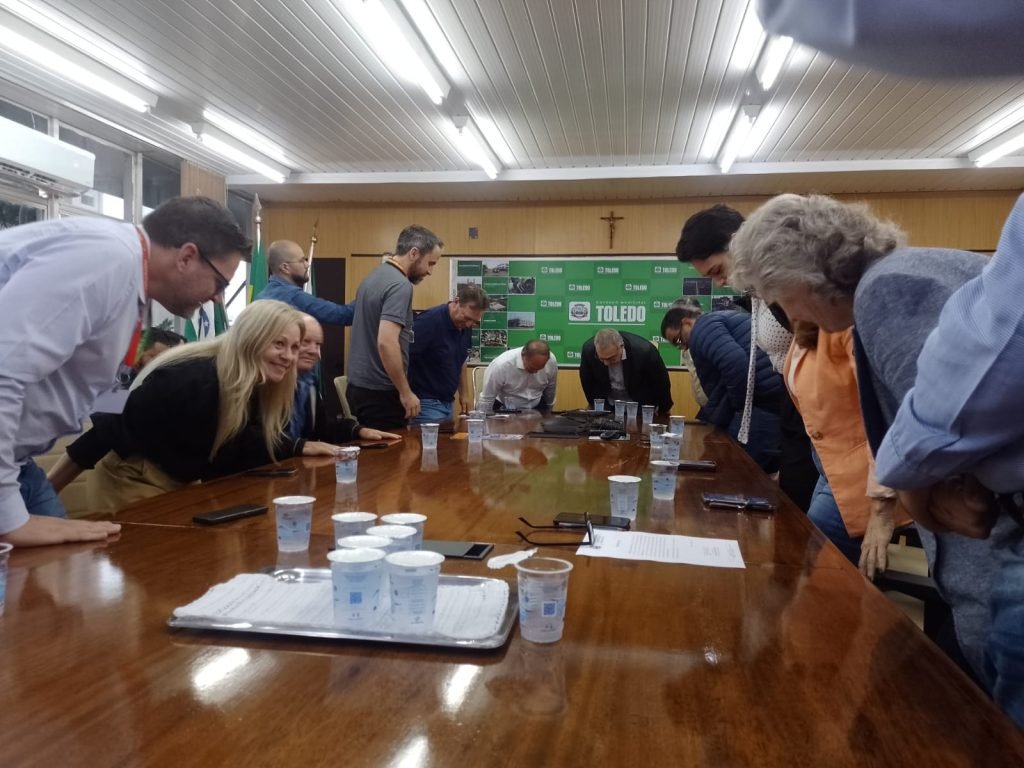 Na manhã desta terça-feira, 18, foi realizada na sala de reuniões do gabinete do prefeito a transmissão do cargo de Prefeito do Município de Toledo pelo Prefeito em Exercício, Lucio de Marchi, ao seu titular, Mario César Costenaro.