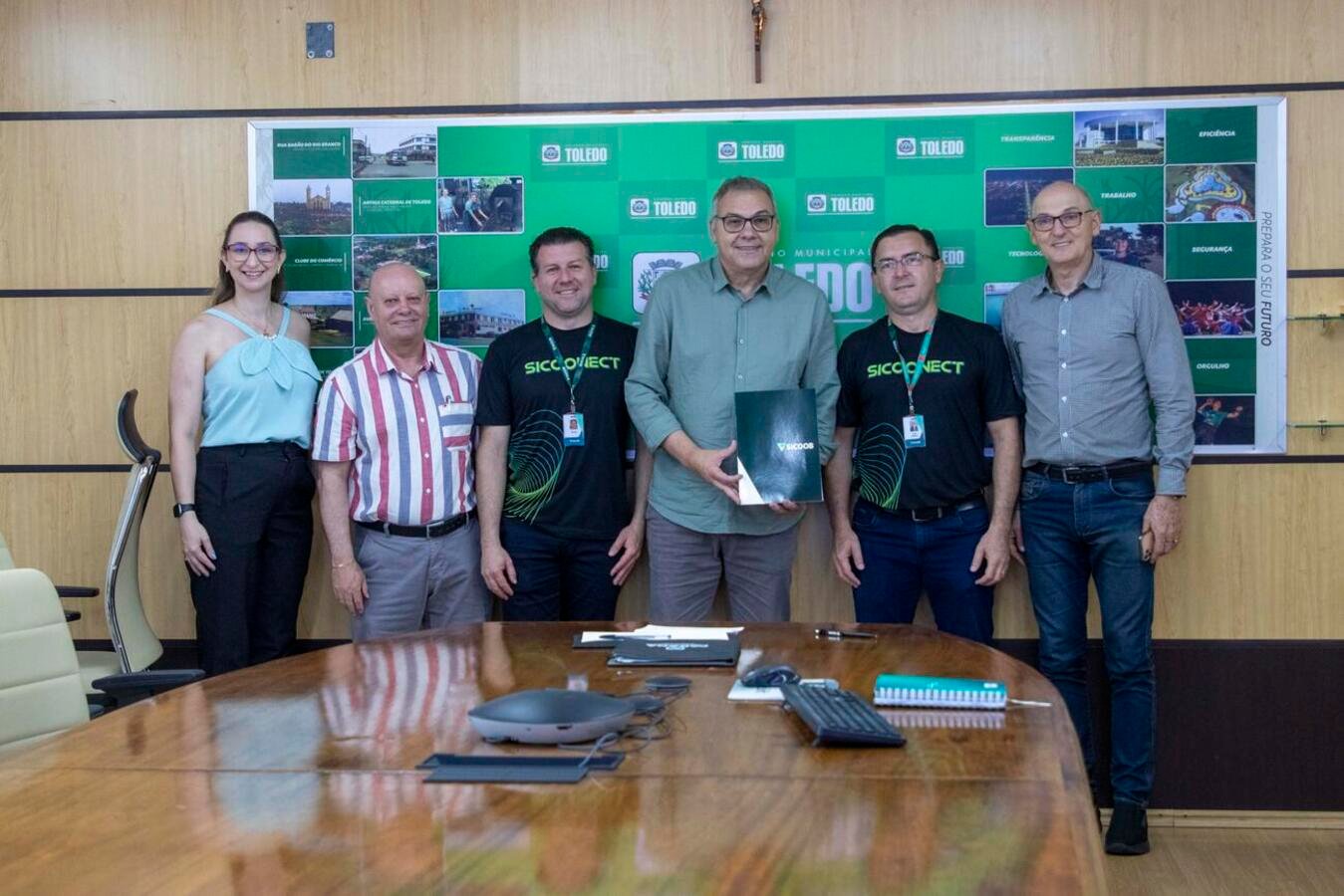 A Prefeitura de Toledo recebeu, nesta semana, no Gabinete do Prefeito, representantes do Banco Cooperativo Sicoob Meridional para assinatura e formalização da abertura da conta bancária oficial do município. A instituição foi habilitada pelo Chamamento Público 008/2025.