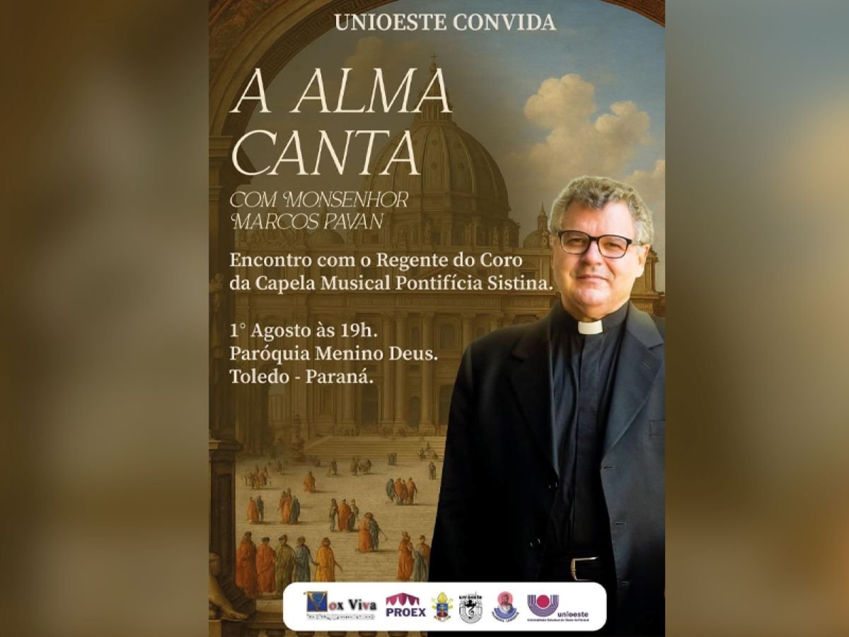 A apresentação de “A Alma Canta – Encontro com Monsenhor Marcos Pavan, regente do coro do Papa” será no dia 1º de agosto, às 19h. A promoção do evento é da Universidade Estadual do Oeste do Paraná – Unioeste, por meio de seu Curso de Filosofia, em que evoca espiritualidade, cultura e arte.