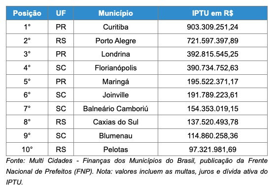 RANKING – AS 10 MAIORES ARRECADAÇÕES DE IPTU NO SUL