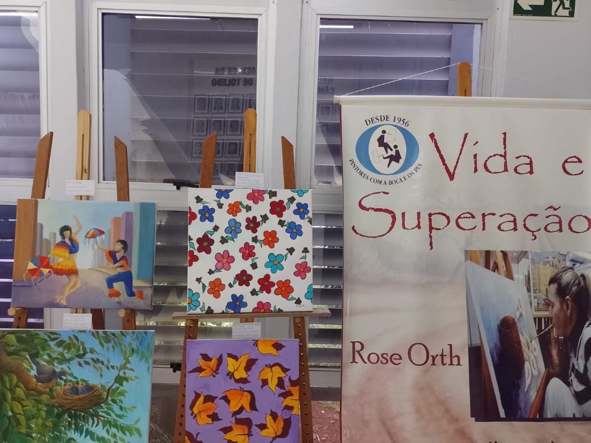 “Estou expondo na Câmara dos Vereadores, aqui em Toledo, com a exposição ‘Momentos Diferentes’. Convido a todos para ir e ver meu trabalho. Esses trabalhos se constituem de dois momentos: um momento em que estou aprendendo a técnica, que aplico geralmente em paisagens brasileiras, e o outro momento é quando me permito criar na tela, expressar minha liberdade e minha maneira de me colocar no mundo. Eu faço parte da Associação Internacional de Pintores com a Boca e com os Pés porque tenho sequelas de poliomielite. Não tenho movimento nos braços e pouco nos pés, então uso a boca para segurar o pincel e pintar”.