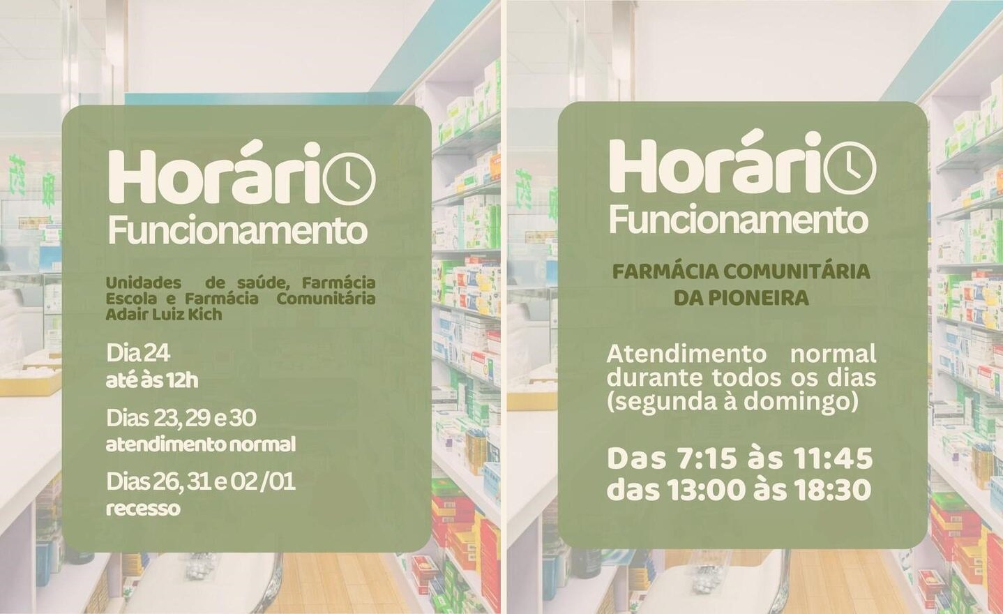 As Unidades Básicas de Saúde (UBS), Farmácia escola, Farmácia Comunitária Adair Luiz Kich, Centros de Atenção Psicossocial (Caps i, Caps AD, Caps II), Central de Especialidades, Centro Especializado de Reabilitação (CER II), Ambulatório Materno Infantil (AMI), Vigilância em Saúde e o Ambulatório de Saúde Mental seguirão o horário de funcionamento da prefeitura: até o meio-dia na véspera de Natal (24), e fechado nos dias 25, 26 e 31 de dezembro, e 1º e 2 de janeiro. Nos dias 23, 29 e 30 o atendimento será normal.