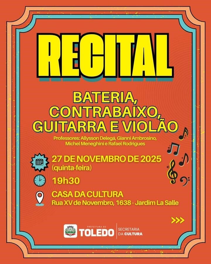 A Secretaria da Cultura, por meio da Casa da Cultura, promoverá uma semana repleta de apresentações culturais de música e dança abertas ao público com entrada gratuita. A programação contará com apresentações de instrumentos de sopro, de cordas e de teclas, danças nas expressões de balé, dança contemporânea e jazz dance e também exposições de desenho e pintura em tela. A programação se inicia nesta terça-feira (25) e finaliza na quarta-feira (3/12) da próxima semana.