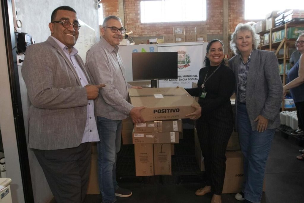 A Secretaria Municipal de Assistência Social (Smas) recebeu, na quinta-feira (30), 23 computadores novos. Os equipamentos serão destinados às seis unidades dos Centros de Referência de Assistência Social (Cras), às unidades de acolhimento e à sede da secretaria. Participaram do ato o prefeito Mario Costenaro, o vereador Professor Oséias, a secretária Simone Ferrari, o secretário de Comunicação, Márcio Pimentel, diretores, coordenadores e outros servidores.
