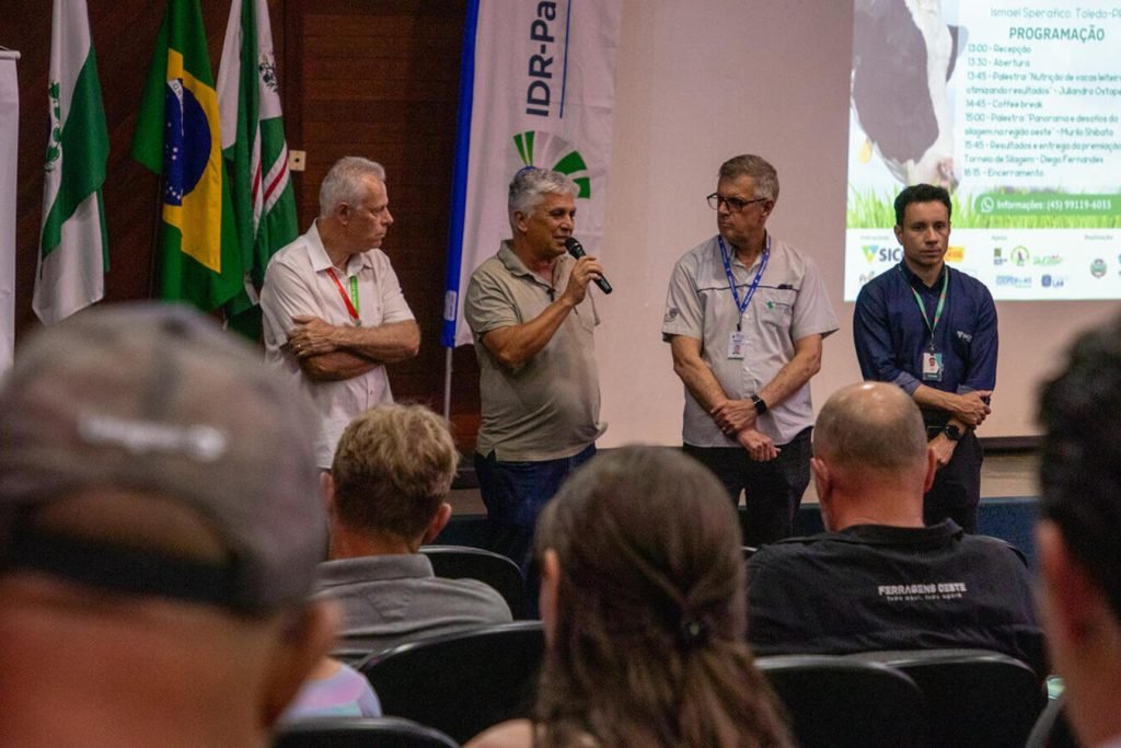 O médico veterinário Juliandro Ostapechen, especialista em bovinocultura leiteira, apresentou a palestra “Nutrição de vacas leiteiras – otimizando resultados”. Em seguida, o zootecnista Murilo Shibata, especialista em gestão e controle de qualidade da produção leiteira, conduziu a exposição “Panorama e desafios da silagem na região oeste”.