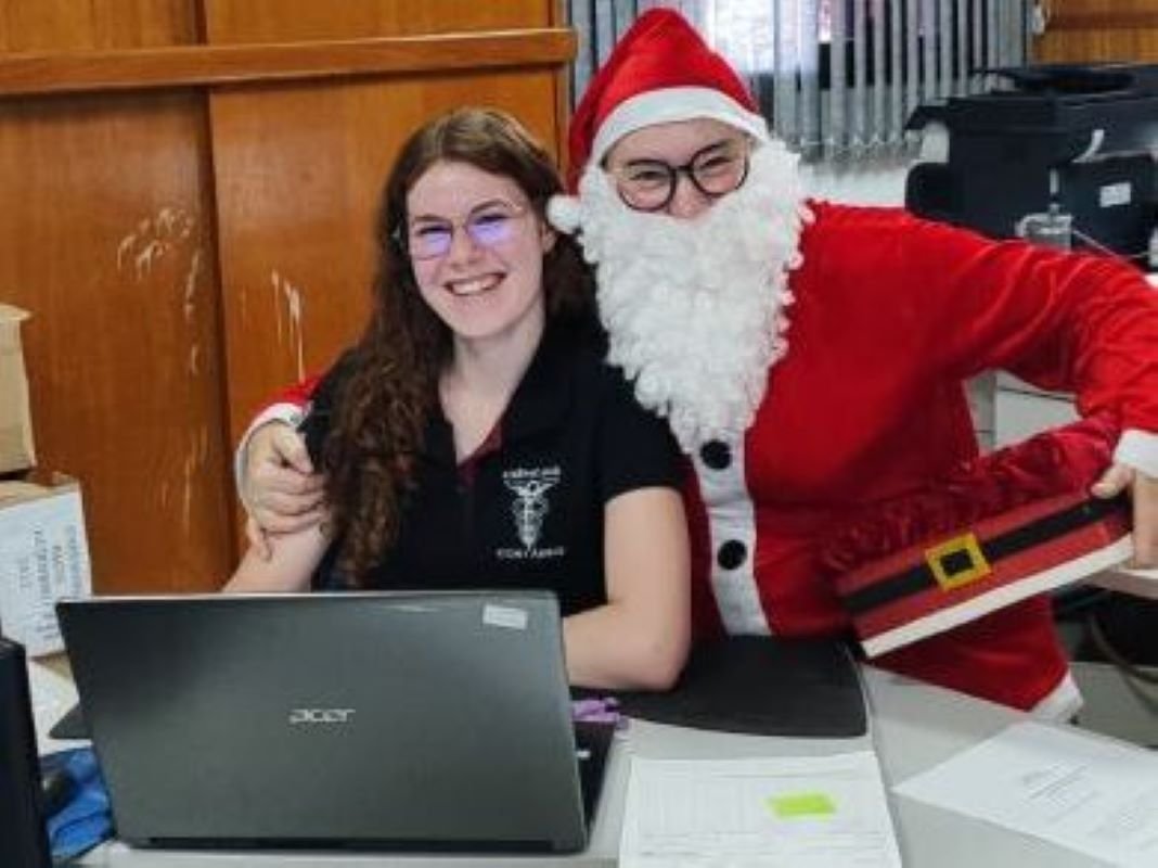 Na manhã desta quarta-feira (17), os servidores públicos do município de Quatro Pontes receberam uma visita diferenciada na sede da Prefeitura Municipal. O Papai Noel, acompanhado da Mamãe Noel e da diretora de Atenção Primária à Saúde, Ana Paula Weyh, percorreu os setores da administração pública municipal.