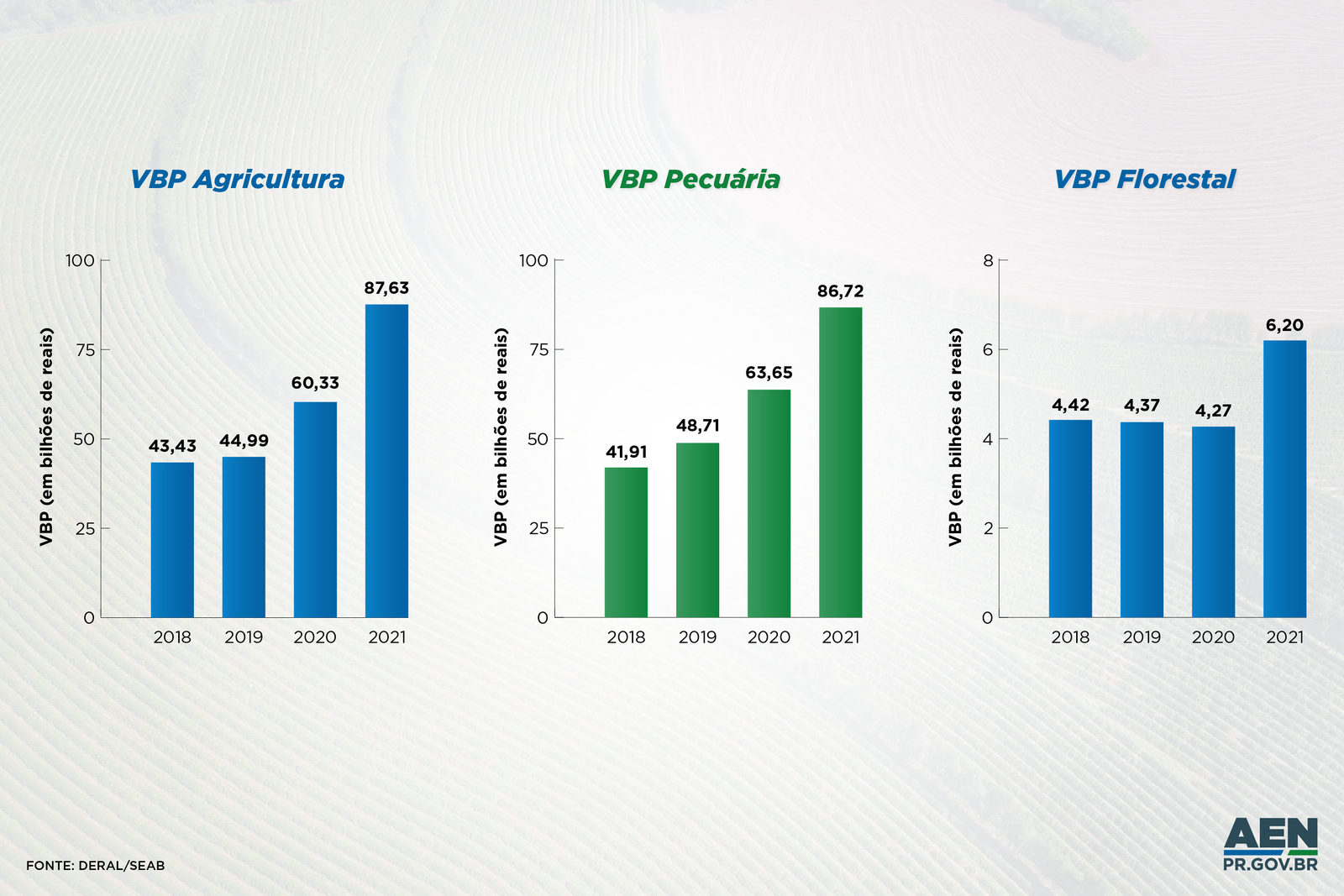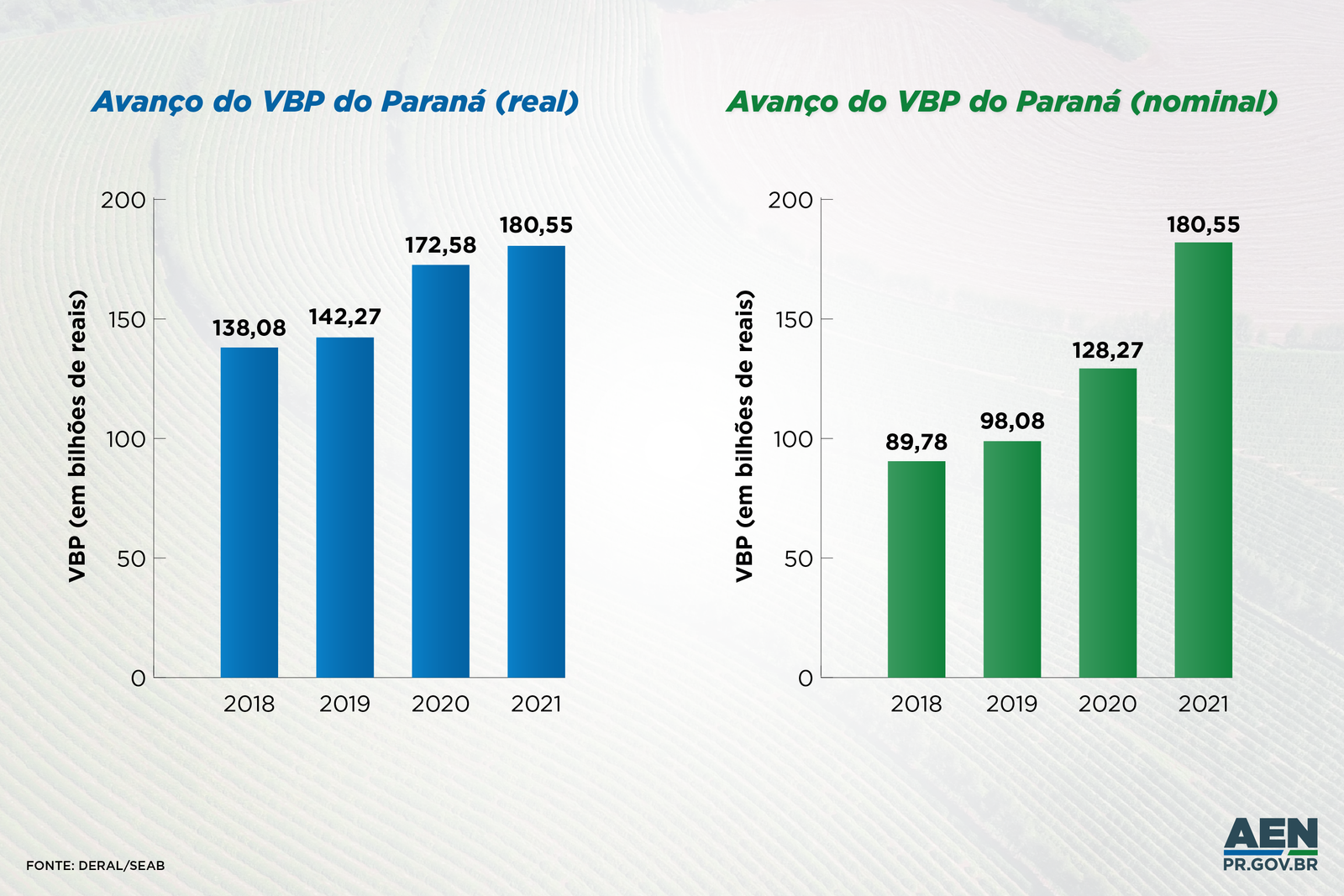 O Valor Bruto da Produção (VBP) agropecuária do Paraná atingiu, em 2021, o maior patamar de sua história, totalizando R$ 180,6 bilhões. Com um avanço médio de 5% ao ano desde 2012, o crescimento da produção agropecuária paranaense deu um salto ainda maior entre 2018 e 2021, durante a gestão de Carlos Massa Ratinho Junior, chegando a um crescimento médio de 9% no período. Em valores nominais, que desconsideram os índices de inflação, a taxa média de avanço foi de 26% por ano.