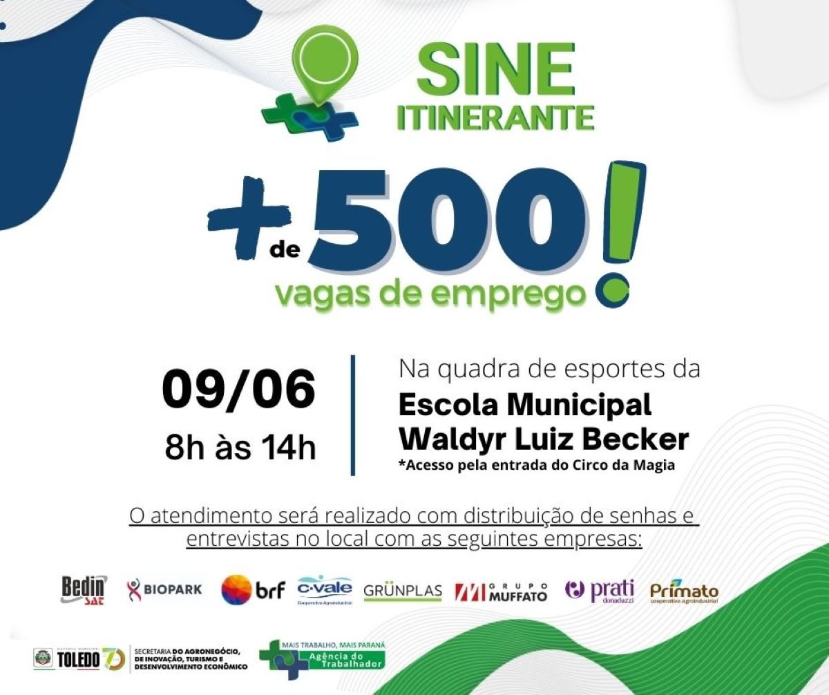 Nesta quinta-feira (09), a Agência do Trabalhador realizará atendimentos na quadra de esportes da Escola Municipal Waldyr Luiz Becker (R. Luís Woiski, 386, Jd Fachini) e encaminhará os candidatos às vagas de empregos diretamente para entrevista com as seguintes empresas que estarão no local: