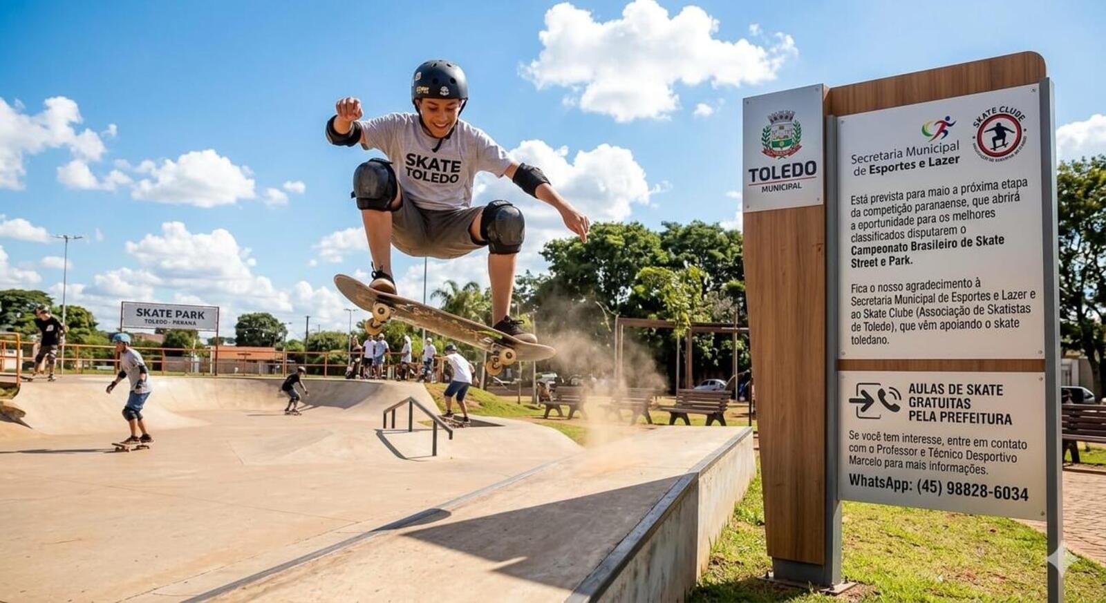 Aos interessados em participar das aulas gratuitas de skate realizadas pela Associação de Skatistas de Toledo em parceria com a Smel, é possível entrar em contato pelo WhatsApp com o número: (45) 98828-6034.