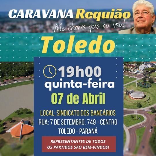 Nesse próximo dia 07, às 19h, estará passando por Toledo a caravana do pré-candidato ao governo do Paraná Roberto Requião. O evento acontecerá no Sindicato dos Bancários, situado na rua 7 de setembro, Centro. Será seu terceiro encontro de uma série de atividades já programadas, visando o dia 02 de outubro. Requião irá visitar todas as regiões e, segundo sua assessoria, “é para dar ouvidos à população e somar forças para a reconstrução do Paraná”.