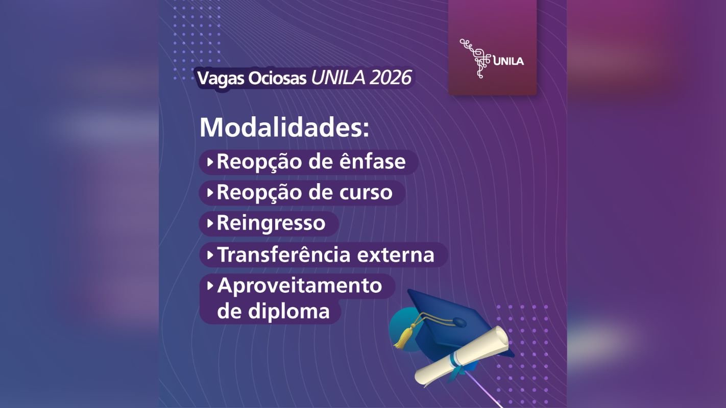 Seguem abertas as inscrições para o Processo Seletivo de Vagas Ociosas na UNILA, para ingresso em 2026. As 639 vagas estão distribuídas entre 28 cursos de graduação, em cinco modalidades distintas. O prazo para as inscrições vai até o dia 6 de outubro de 2025. Todo o processo seletivo e os cursos são gratuitos.