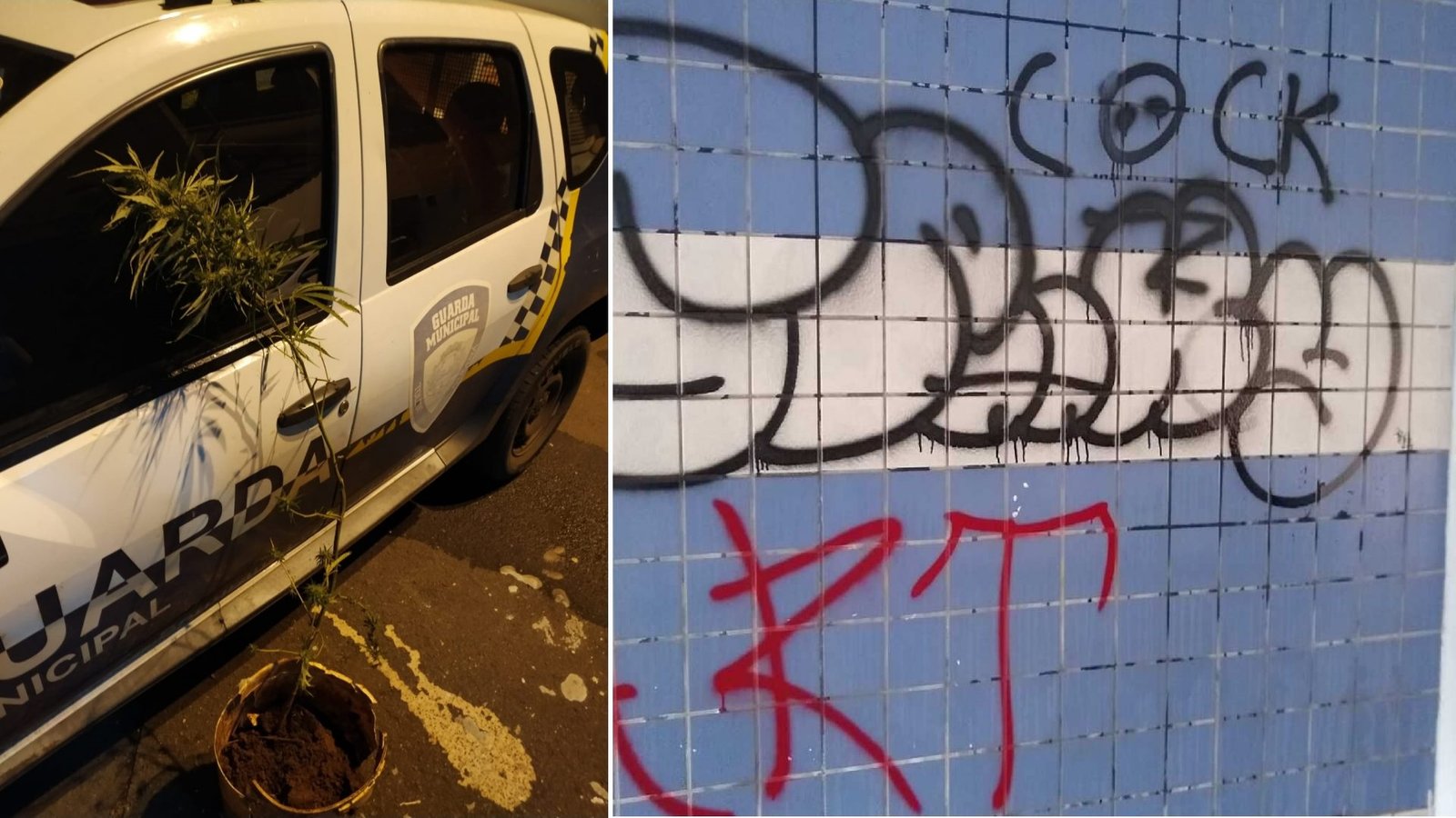 Duas ações positivíssimas para a nossa Guarda Municipal e seus agentes que marcaram essa semana. Primeiro, a descoberta de um grande pé de MACONHA e a segunda, a detenção de 3 adolescentes pichadores do patrimônio público. Creio que o pé de Cannabis sativa deve ser incinerado sem ser enrolado e os 3 aborrecentes, tiveram que limpar toda suas obras de vandalismo.
