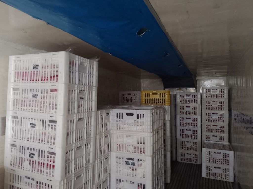 ARMAZENAMENTO – Após a montagem, todos os potinhos são imediatamente encaminhados para um caminhão equipado com câmara fria, onde permanecem armazenados a 3°C até o dia da distribuição. O processo garante conservação adequada, frescor e segurança alimentar, já que os potes não ficam expostos em nenhum momento. Segundo Tharles Setti, o transporte refrigerado é contínuo: “Assim que embalamos, já colocamos no caminhão, onde ficam o tempo todo até domingo”. No dia da festa, o veículo é levado ao Parque Ecológico e, cerca de 30 minutos antes do início da entrega, a equipe retira os potes para servir à população ainda frescos e na temperatura ideal.
