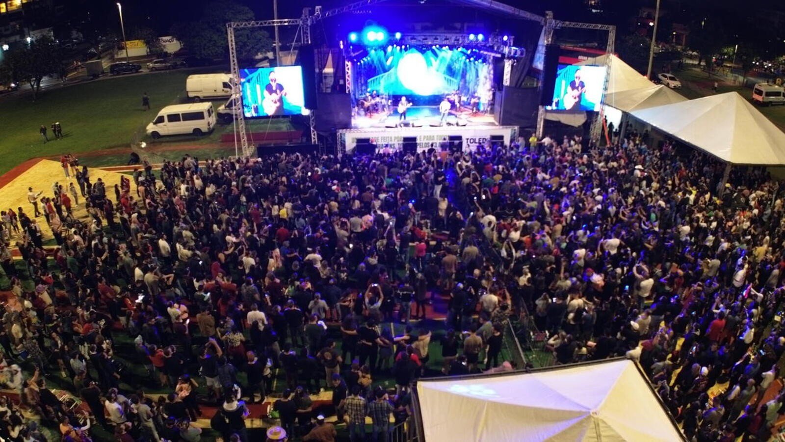 O prefeito Mario Costenaro cumprimentou o público antes do show principal e destacou que o aniversário de 73 anos de Toledo é resultado da participação direta da população, ressaltando a presença das pessoas mesmo diante da chuva. Em sua fala, afirmou que “Toledo somos todos nós”, enfatizando a força, a resiliência e a perseverança dos moradores na construção da cidade, e conduziu o público em um momento coletivo de comemoração, convidando todos a cantar os parabéns em homenagem ao município.