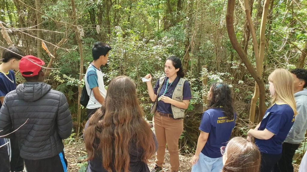 PROGRAMAÇÃO – A Trilha Guiada “O Marreco Começa Aqui”, liderada pela SMMA, monitora a qualidade da água com apoio de alunos da Universidade Federal do Paraná (UFPR). A bióloga da Secretaria do Meio Ambiente, Lilian Cardoso, explicou aos alunos do Colégio Estadual do Jardim Gisella o trabalho realizado, principalmente na nascente do Rio Marreco.