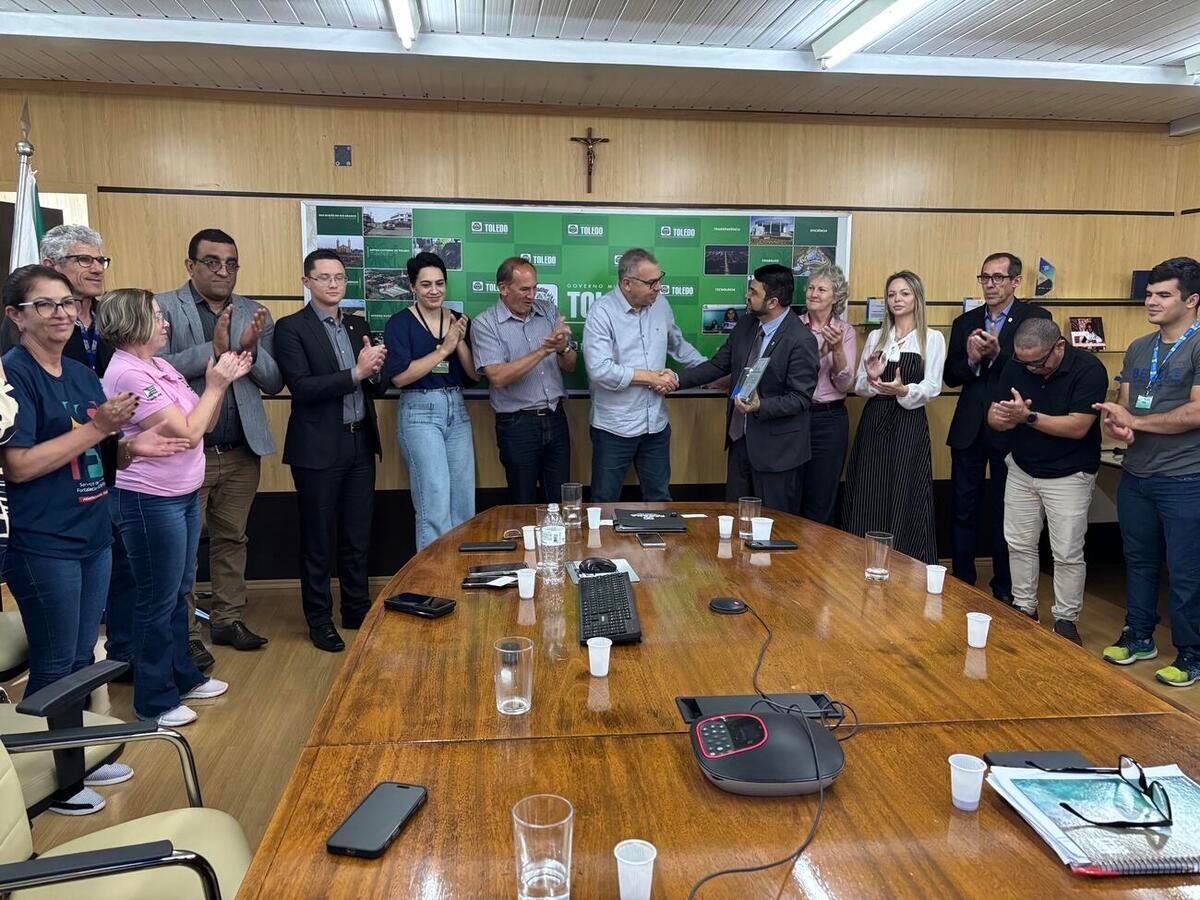 Uma equipe do Marco da Criança e do Adolescente, com sede em Curitiba, incluindo o presidente Evandro Dal Molin, visitou a Prefeitura de Toledo, na terça-feira (9). O objetivo foi entregar um certificado de “Prefeito Amigo da Criança” ao prefeito Mario Costenaro, em reconhecimento pela contribuição para o desenvolvimento de políticas públicas que promovem o bem-estar das crianças.