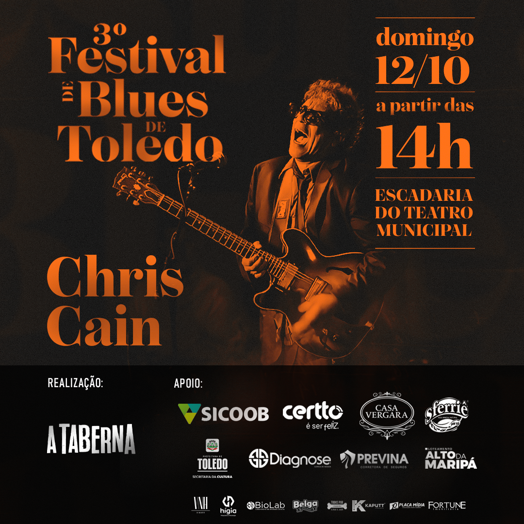 Ao lado de Cassio Albernaz e Amigos do Blues, André Fernandes Blues Trio e Talking Blues, Toledo recebe o renomado guitarrista norte americano Chris Cain, reconhecido como um dos grandes nomes globais do blues em atividade. O evento está em sua terceira edição e segue, de forma independente, contribuindo com o fomento cultural, econômico, turístico e artístico da cidade e da região.