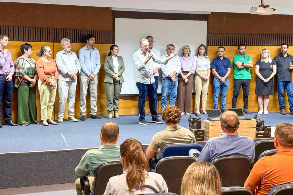 Autoridades – A solenidade de entrega dos kits tecnológicos foi prestigiada por gestores da área e lideranças políticas, como o deputado federal Dilceu Sperafico. O Município de Toledo foi representado pelo prefeito Mario Costenaro; pela secretária da Educação, Janice Salvador; e pelos vereadores Gabriel Baierle (presidente da Câmara Municipal) e Jairo Cerbarro.