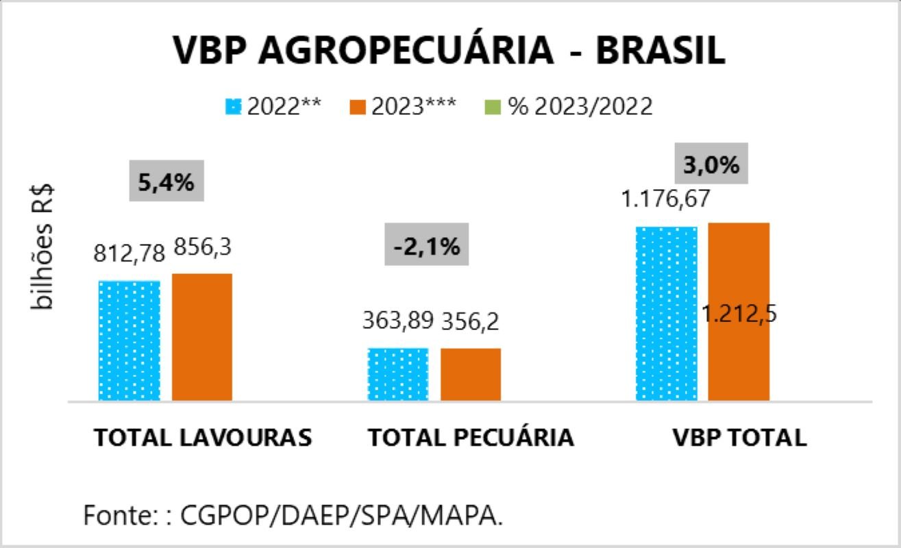 Com a previsão de chuvas para 2023, o VBP para o próximo ano é estimado em R$ 1,212 trilhão, 3% acima do projetado para este ano, conforme informações preliminares.